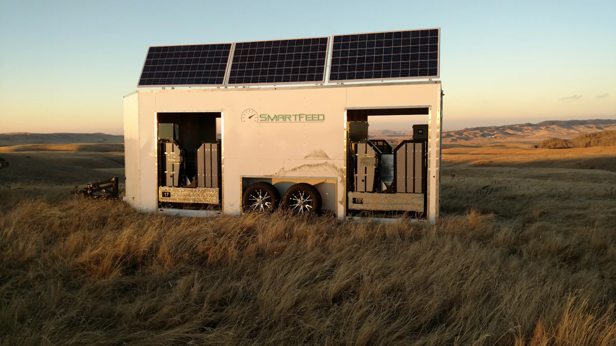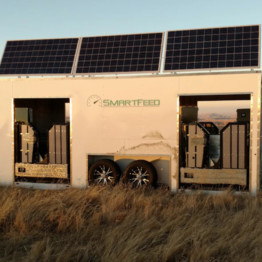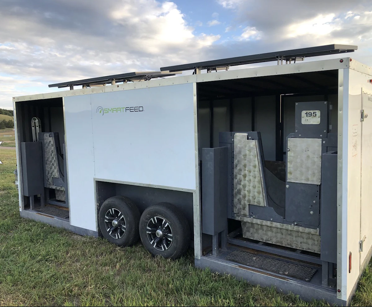 SmartFeed unit trailer for pasture application. Includes solar, battery, charge controller and hydraulic jacks for raising and lowering trailer. Easy to tow in any pasture setting, with wifi connect-ability or cellular modem depending on country.
